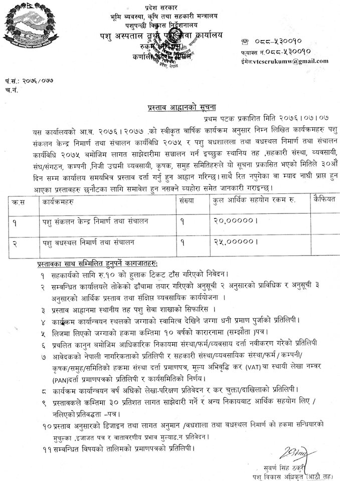 रुकुम पश्चिम। पशु अस्पताल तथा पशु सेवा कार्यलय रुकुम पश्चिमले आर्थिक वर्ष ७६ / ७७ को वार्षिक स्वीकृत कार्यक्रम अन्र्तगत अनुदानका विभिन्न कार्यक्रम संचालन गर्ने भएको छ । कार्यलयले मिति २०७६ / ७ / ७ गते सूचना प्रकाशित गरि कार्यक्रममा समावेश हुन स्थानीय तह, कृषक समूह, कृषि सहकारी, कम्पनीलाई आव्हान गरेको हो ।