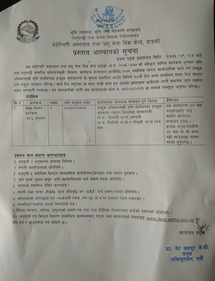 दाङ्ग। भेटेरिनरी अस्पताल तथा पशु सेवा विज्ञ केन्द्र दाङ्गले आर्थिक वर्ष ७६ / ७७ को स्वीकृत कार्यक्रम अन्र्तगत बाख्रा मिशन कार्यक्रम संचालन गर्ने भएको छ । यसका लागि केन्द्रले सूचना प्रकाशित भएको मितले ३० दिन भित्र सम्पर्क गर्न कृषक, कृषि फार्म आदिलाई आव्हान गरेको छ ।