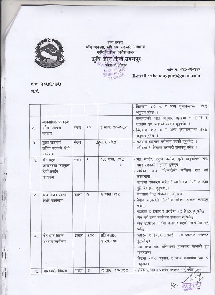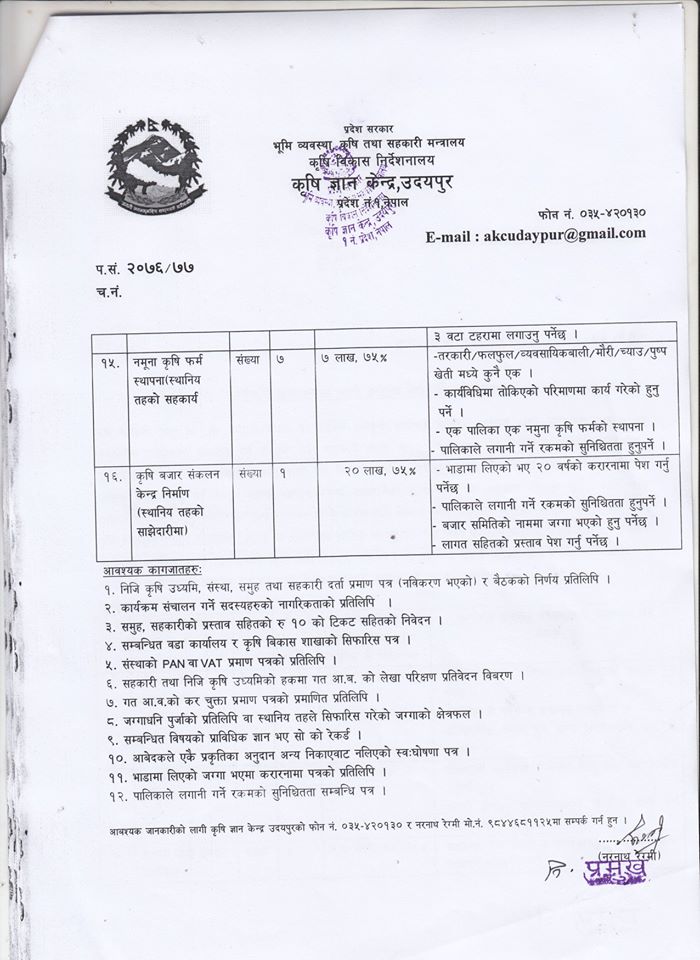 उदयपुर। कृषि ज्ञान केन्द्र उदयपुरले आर्थिक वर्ष ७६ / ७७ को स्वीकृत वार्षिक कार्यक्रम अन्र्तगत विभिन्न अनुदानमा आधारीत कृषि कार्यक्रम संचालन गर्ने भएको छ । यसका लागि केन्द्रले सूचना प्रकाशित गरी १५ दिन भित्र निवेदन पेश गर्न सम्पूर्ण कृषकहरुलाई आव्हान गरेको छ ।