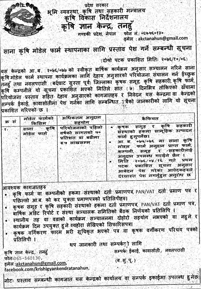 तनहुँ। भूमि व्यवस्था कृषि तथा सहकारी मन्त्रालय कृषि विकास निर्देशनालय कृषि ज्ञान केन्द्र तनहुँले आर्थिक वर्ष ७६ / ७७ को स्वीकृत वार्षिक कार्यक्रम अन्र्तगत साना कृषि मोडल फार्म स्थापना गर्ने भएको छ । यसका लागि केन्द्रले सूचना प्रकाशित भएको मितिले ७ दिन भित्र सम्पर्क गर्न आव्हान गरेको छ ।