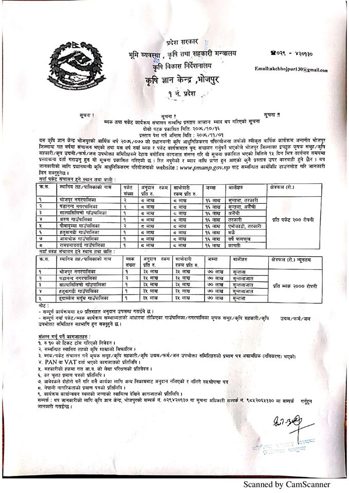 भोजपुर। भूमि व्यवस्था कृषि तथा सहकारी मन्त्रालय प्रदेश नं १ ले आर्थिक वर्ष ७६ / ७७ को स्वीकृत वार्षिक कार्यक्रम अन्र्तगत प्रधानमन्त्री कृषि आधुनिकिकरण परियोजना मार्फत व्लक तथा पकेट कार्यक्रम संचालन गर्ने भएको छ । यसका लागि केन्द्रले सूचना प्रकाशित गरी १५ दिन भित्र ईच्छुक कृषि सहकारी, कृषि समुह, उद्यमी,कृषि फार्म, जल उपभोक्ता समितिलाई प्रस्ताव पेश गर्न आव्हान गरेको छ ।