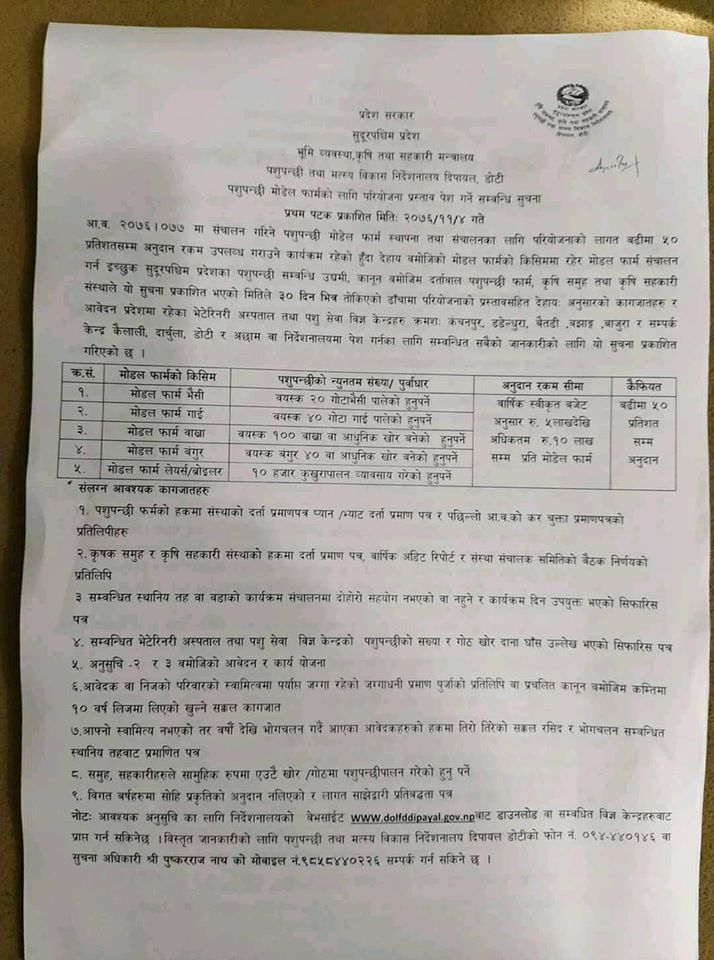 दिपायल। भूमि व्यवस्था कृषि तथा सहकारी मन्त्रालय सुदूरपश्चिम प्रदेशले आर्थिक वर्ष ७६ / ७७ को वार्षिक स्वीकृत कार्यक्रम अन्र्तगत पशुपन्छीं मोडेल फार्म स्थापना तथा संचालनका लागि परियोजनाको लागि बढीमा ५० प्रतिशत अनुदान रकम उपलब्ध गराउने भएको छ । यसका लागि इच्छुक कृषक, कृषि उद्यमी, कृषि सहकारी, कृषि समूह आदिले सूचना प्रकाशित भएको मितले ३० दिन भित्र सम्पर्क गर्न सक्नेछन् ।