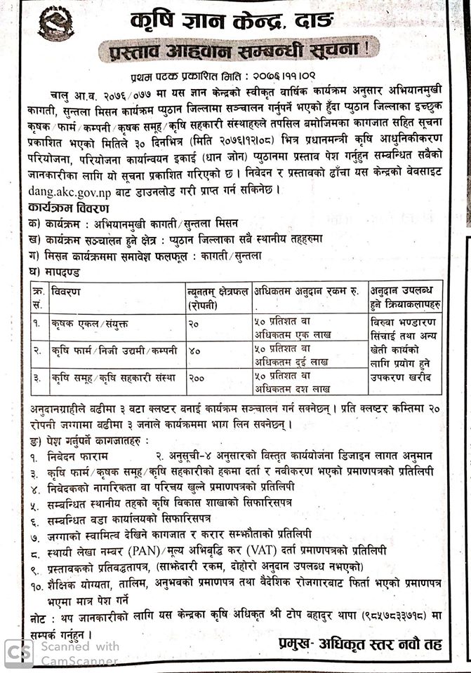 प्युठान। कृषि ज्ञान केन्द्र दाङले आर्थिक वर्ष ७६ / ७७ को स्वीकृत वार्षिक कार्यक्रम अन्र्तगत प्युठान जिल्लामा कागती एवं सुन्तला अभियानमुखी कार्यक्रम संचालन गर्ने भएको छ । यसका लागि केन्द्रले सूचना प्रकाशित गरी जिल्लाका सबै स्थानीय तहमा बसोबास गर्ने ईच्छुक कृषक, कृषि फार्म, कम्पनी, कृषि समूह, कृषि सहकारीलाई सूचना प्रकाशित भएको मितिले ३० दिन भित्र प्रधानमन्त्री कृषि आधुनिकीकरण परियोजना, परियोजना इकाई धान जोन प्युठानमा प्रस्ताव पेश गर्न आव्हान गरेको छ ।