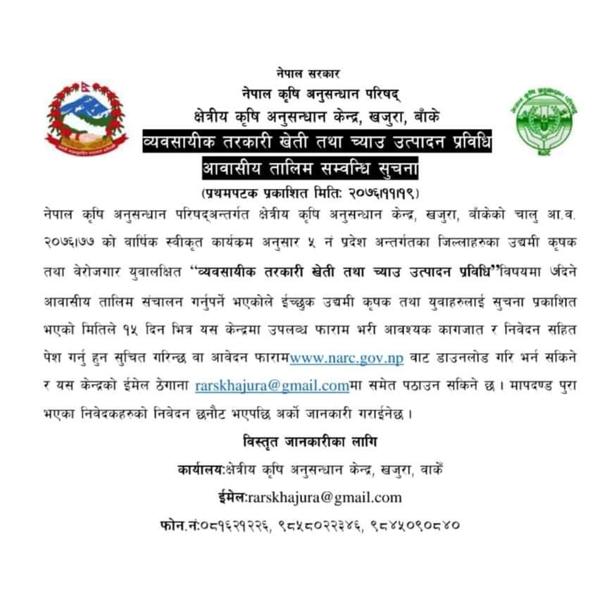 बाँके। नेपाल कृषि अनुसन्धान परिषद् क्षेत्रीय कृषि अनुसन्धान केन्द्र खजुरा बाँकेले आर्थिक वर्ष ७६ / ७७ को स्वीकृत वार्षिक कार्यक्रम अन्र्तगत व्यवसायीक तरकारी खेती तथा च्याउ उत्पादन प्रविधि आवासीय तालिम संचालन गर्ने भएको छ । यसका लागि केन्द्रले सूचना प्रकाशित गरी प्रदेश नं ५ भित्रका उद्यमी कृषक, तथा वेरोजगार युवाहरुलाई सूचना प्रकाशित भएको मितिले १५ दिन भित्र आवश्यक कागजात र निवेदन सहित पेश गर्न आव्हान गरेको छ ।