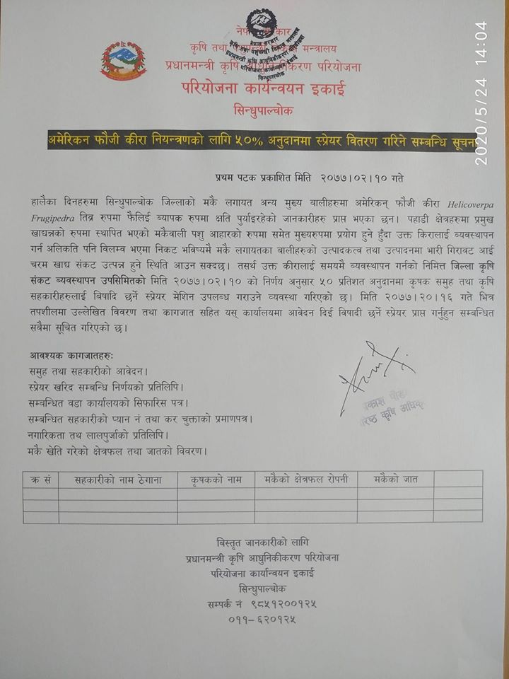 सिन्धुपाल्चोक। हाल अधिकांश क्षेत्रका किसान फौजी कीराको प्रकोपले आका्रन्त छन् । यसैलाई मध्याजर गरी प्रधानमन्त्री कृषि आधुनिकीकरण परियोजना परियोजना कार्यन्वयन इकाई कार्यालय सिन्धुपाल्चोकले ५० प्रतिशत अनुदानमा बिषादी छर्ने स्प्रेयर मेशिन उपलब्ध गराउने भएको छ । यसका लागि सूचना प्रकाशित मितिले १ हप्ता भित्र कार्यालयमा कृषि समुह, कृषि सहकारीलाई आग्रह गरिएको छ ।
