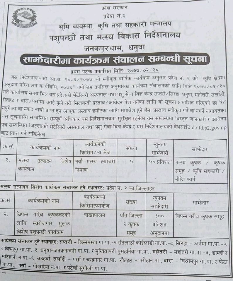 जनकपुरधाम। भूमि व्यवस्था कृषि तथा सहकारी मन्त्रालय पशुपन्छीं तथा मत्स्य विकास निर्देशनालय प्रदेश नं २ ले आर्थिक वर्ष ७६/ ७७ को स्वीकृत कार्यक्रम अन्र्तगत साझेदारीमा मत्स्य उत्पादन विशेष कार्यक्रम संचालन गर्ने भएको छ । यसका लागि निर्देशनालयले एक सूचना जारी गरि कृषि क्षेत्रमा अनुदान परिचालन कार्यविधि २०७६ भित्र रहि आवेदन पेश गर्न आग्रह गरेको छ । यस कार्यक्रम प्रदेश नं २ को सप्तरी, सिरहा, धनुषा, महोत्तरी, सर्लाही, रौतहट, बारा र पर्सामा संचालन हुने छ । यसका लागि ईच्छुक मत्स्य कृषक, कृषक समूह, कृषि सहकारी,नीजि फर्म ले आवेदन पेश गर्न सक्ने छन् । रित नपुगेका वा म्याद नाघी आएका प्रस्ताव छनौटका लागि समावेश नहुने निर्देशनालयले जनाएको छ ।