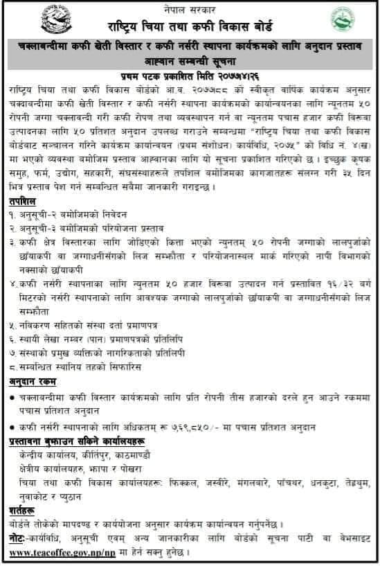 ललितपुर। राष्ट्रिय चिया तथा कफी विकास वोर्डले आर्थिक वर्ष ७७/७८ को स्वीकृत वार्षिक कार्यक्रम अन्र्तगत चक्लाबन्दीमा कफी खेती विस्तार र नर्सरी स्थापना गर्नेलाई अनुदान उपलब्ध गराउने भएको छ । यसका लागि वोर्डले सूचना प्रकाशित गरी न्यूनतम ५० हजार कफीको विरुवा उपलब्ध गराउन सक्ने ईच्छुक कृषक, समुह, फर्म, उद्योग, सहकारी, संघसंस्थाहरुले आवश्यक कागजातहरु संकलन गरी ३५ दिन भित्र प्रस्ताव पेश गर्न आव्हान गरेको छ ।