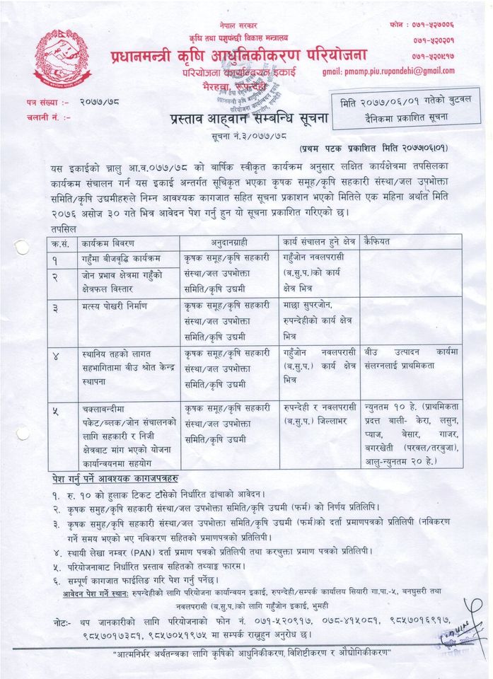 बुटवल। प्रधानमन्त्री कृषि आधुनिकीकरण परियोजना परियोजना कार्यान्वयन इकाई भैरहवा रुपन्देहीले आर्थिक वर्ष ७७ /७८ को वार्षिक स्वीकृत कार्यक्रम अन्र्तगत विभिन्न कार्यक्रम संचालन गर्ने भएको छ । यसका लागि परियोजना कार्यन्यवन ईकाई रुपन्देहीले सूचिकृत भएका कृषक समुह, कृषि सहकारी, संस्था, जल उपभोक्ता समिति एवं उद्यमीलाई आवश्यक कागजतात सहित सूचना प्रकाशित भएको मितिले एक महिना भित्र आवेदन पेश गर्न आव्हान गरेको छ ।