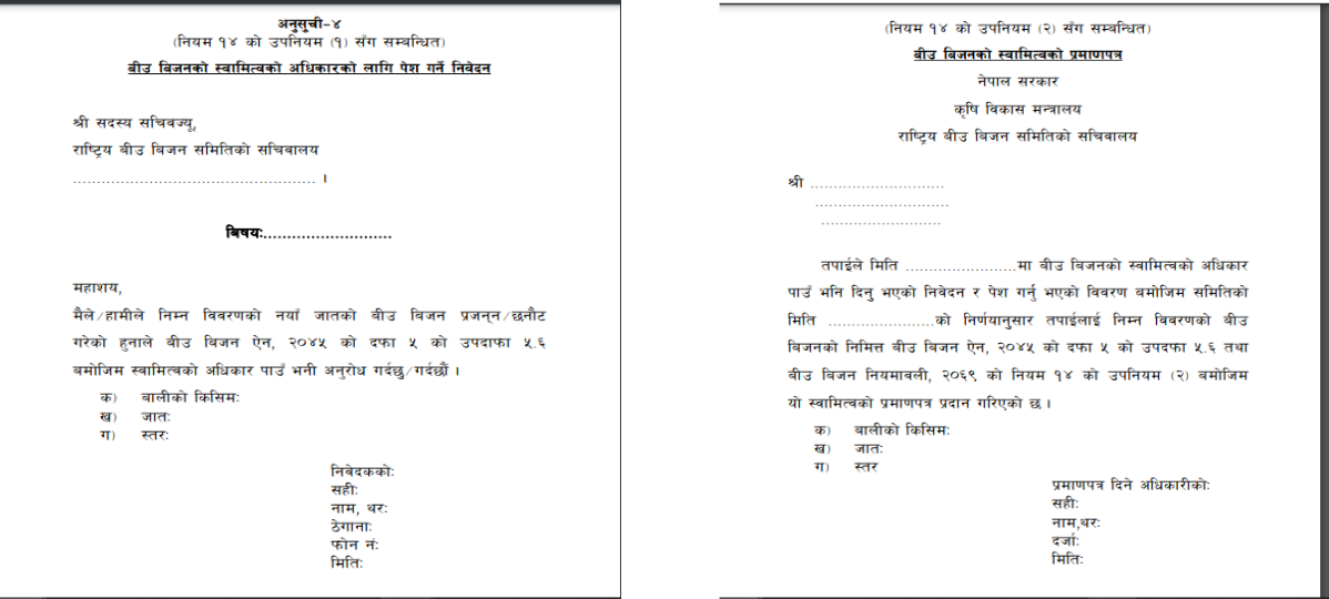 12.2 To register local landraces of Nepal, the seed producer should give an application in the given format to the sub-committee.