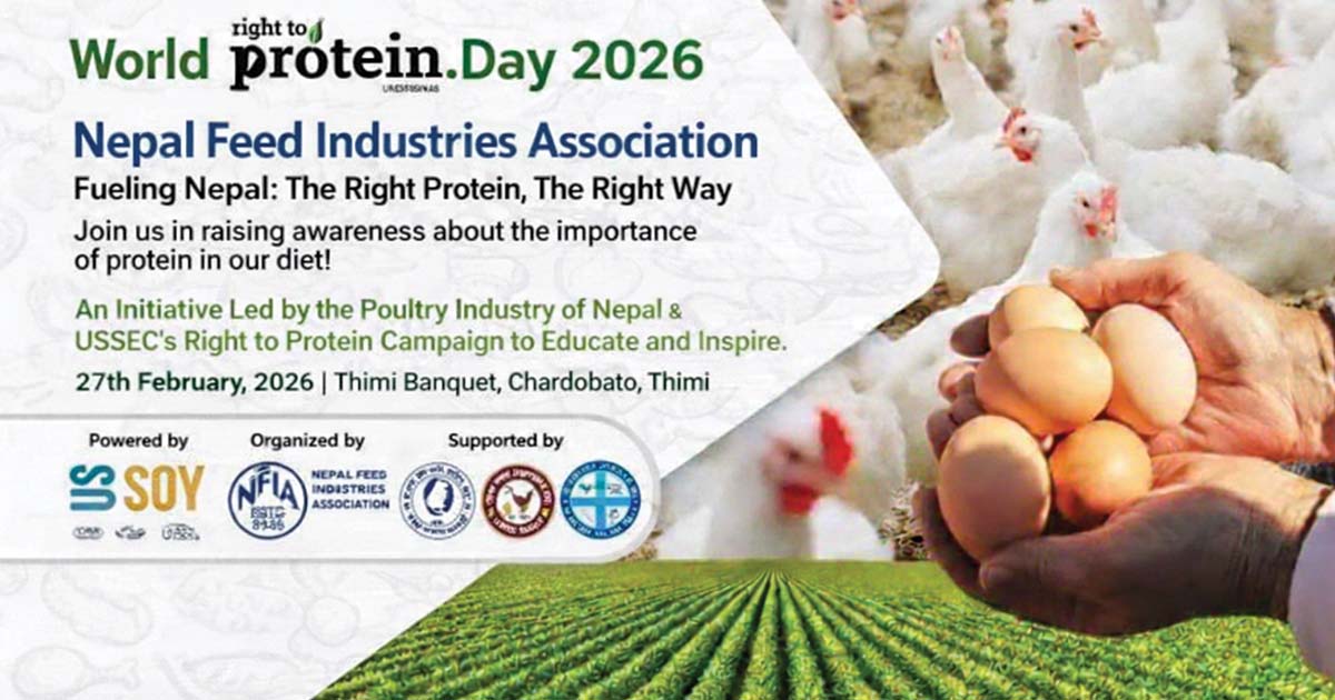 ललितपुर। मानव स्वास्थ्यमा प्रोटिनको महत्त्वबारे जनचेतना अभिवृद्धि गर्ने उद्देश्य सहित ‘विश्व प्रोटिन दिवस २०२६’ मनाइने भएको छ। भक्तपुरको थिमि व्याङ्क्वेटमा आयोजना हुने उक्त कार्यक्रम नेपाल दाना उद्योग संघ को आयोजना तथा युनाइटेड स्टेट्स सोयाबिन एक्सपोर्ट काउन्सिल को सहयोगमा सम्पन्न हुने आयोजकले जनाएको छ।